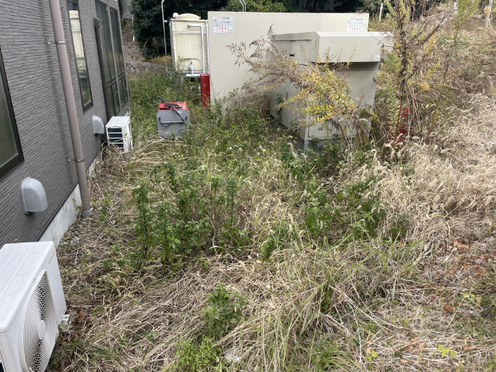 室外機や設備の周りなど、草が生い茂ると見栄えが悪いだけでなく、機械のトラブルや虫の発生にもつながりかねません。 大切な施設を長く快適に使っていただけるよう、機械周りの配線などにも細心の注意を払いながら、丁寧に草を刈り取っていきました。
