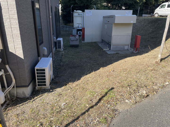 いかがでしょうか? 地面がしっかりと見え、風通しも良くなりました。 これなら設備の点検もしやすいですし、何より見た目がスッキリして清潔感が出ますね。